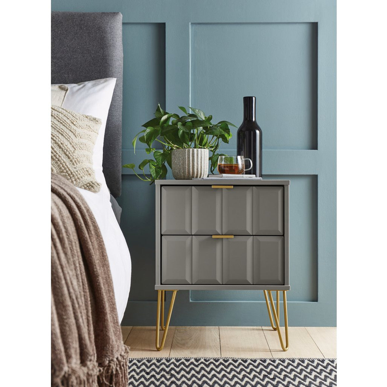 This 2 drawer bedside cabinet is practical and stylish. Perfect for any bedside or as a free standing storage unit. A modern and distinctive range. Named for the unique "Cube" patten of the drawer and door fronts. Also features Gold Metal Handles and Gold Hairpin Legs. Comes in a wide range of colours including eye cathching two tone colour combinations.